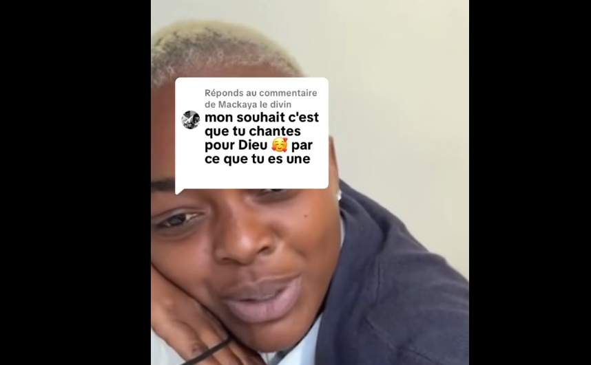 « Je chante pour Dieu, ma chérie, je chante déjà pour Dieu », a-t-elle déclaré. Fredonnant même un court extrait de son titre « Bouge ton body », l’artiste a poursuivi en affirmant que son talent était d’origine divine : « c’est Dieu qui m’a donné la voix, c’est Dieu qui m’a rendu fantastique, c’est Dieu qui m’a rendu géniale, c’est Dieu qui m’a donné cette voix de la gloire céleste. Tu crois que je chante pour qui ? C’est Dieu qui a créé tous les hommes sur terre, c’est Dieu qui a créé toutes les femmes sur terre, tu penses que je chantes pour qui ? Je chante pour Dieu », a-t-elle conclu.