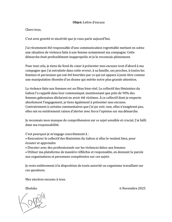 Eboloko présente ses excuses publiques après la polémique sur les violences faites aux femmes