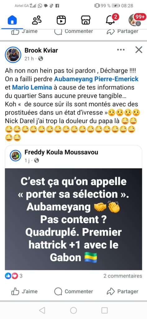 Dans un commentaire devenu viral, l’internaute Brook Kviar a ravivé un épisode douloureux : « Ah non non hein, pas toi pardon. Décharge ! On a failli perdre Aubameyang Pierre-Emerick et Mario Lemina à cause de tes informations du quartier sans aucune preuve tangible… Kho ! De source sûre, ils sont montés avec des prostituées dans un état d’ivresse », a-t-elle écrit, en référence aux accusations portées à l’époque par le journaliste.
