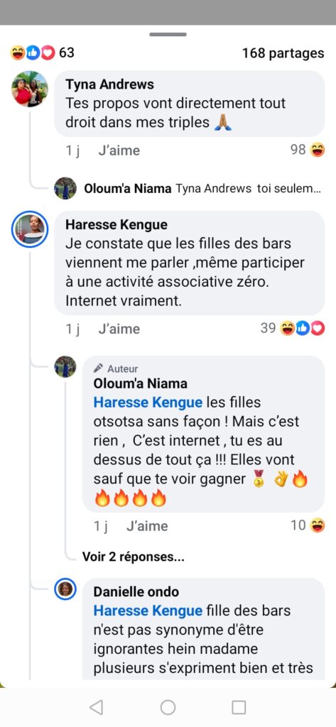Alors qu’elle est depuis plusieurs jours la cible de vives attaques et de moqueries sur les réseaux sociaux, Haresse Kengue est finalement sortie de son silence. Ce mercredi 24 septembre, la candidate indépendante du 6ᵉ arrondissement de Libreville a répondu à ses détracteurs dans un commentaire qui n’est pas passé inaperçu, les qualifiant de « filles de bars ».