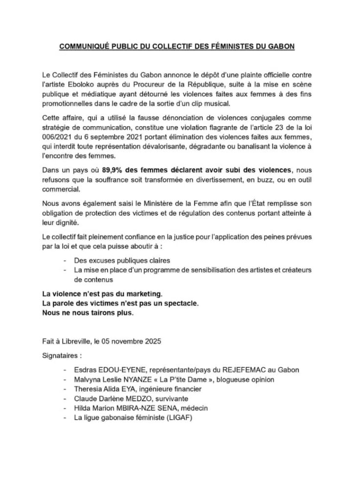 Le collectif indique avoir saisi le procureur de la République, reprochant à l’artiste d’avoir mis en scène une fausse dénonciation de violences conjugales à des fins de publicité. « Cette affaire constitue une violation flagrante de l’article 23 de la loi n°006/2021 du 6 septembre 2021 portant élimination des violences faites aux femmes, qui interdit toute représentation dévalorisante, dégradante ou banalisant la violence à l’encontre des femmes », dénonce le communiqué. Le collectif rappelle par ailleurs qu’au Gabon, « 88,9 % des femmes déclarent avoir subi des violences ».