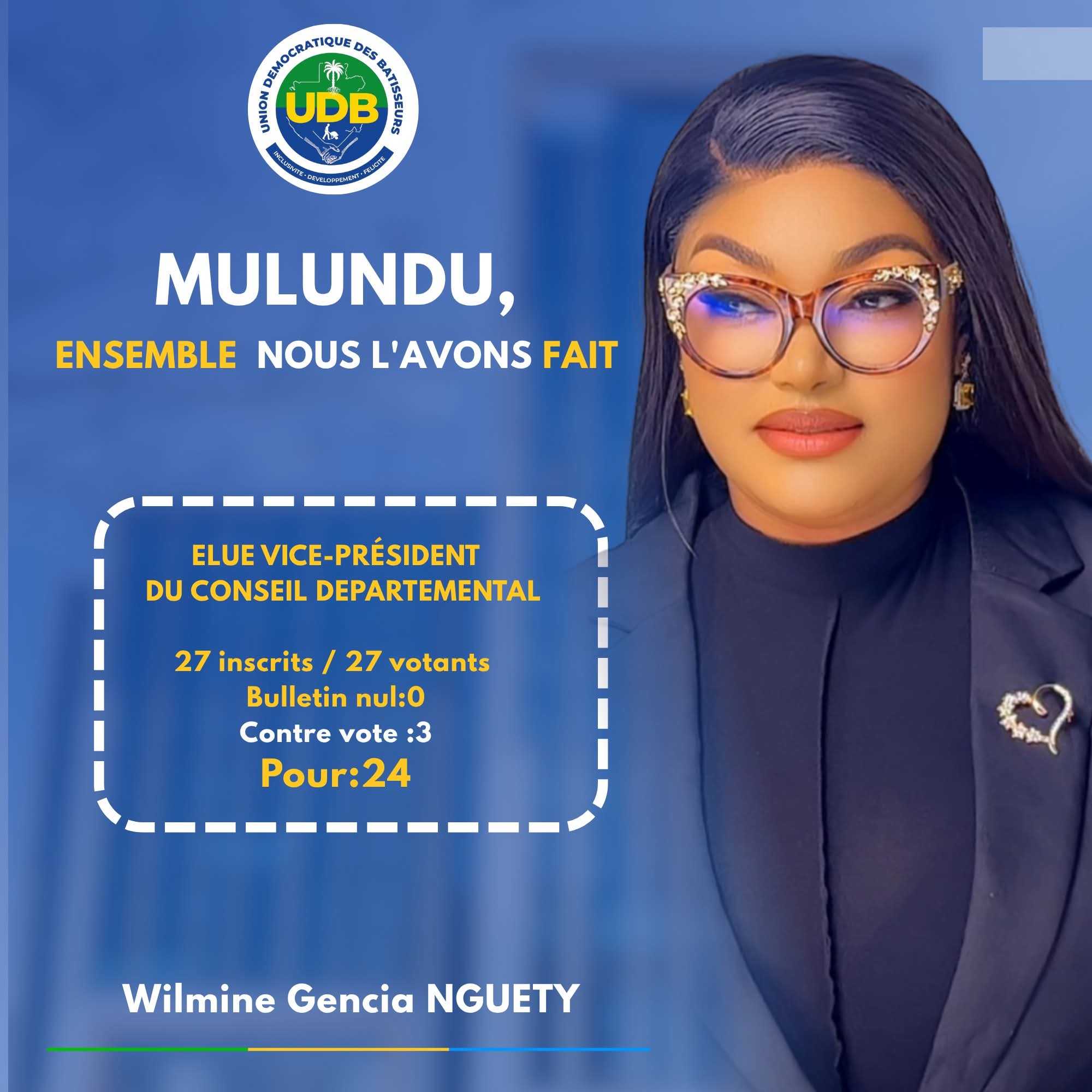 À l’issue de sa victoire, elle a dédié son élection au chef de l’État : « Cette victoire est dédiée à Monsieur le président de la République, Son Excellence Brice Clotaire Oligui Nguema, grâce à qui un renouvellement progressif de la classe politique est désormais possible ». Elle a également remercié les populations : « Populations de Mulundu, une nouvelle ère s’ouvre. Nous passerons les cinq prochaines années à votre service, et ensemble nous restaurerons et bâtirons notre département ».